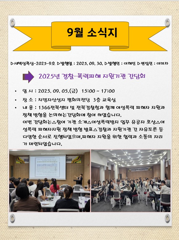 - 2025년 찾아가는 경찰간담회 김제경찰서 *일 시: 2025년 9월 9일(화) 오전 10:00~11:00*장 소:전북 김제경찰서*내 용:여성폭력 피해자 지원기관과 경찰관이 함께 성폭력 피해자 중심의