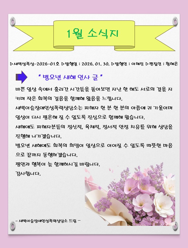 - 안녕하세요.새벽이슬장애인성폭력상담소는 1월에도 장애인 성폭력 피해자들의 회복과 지지를 위해 다양한 활동을 진행하였습니다.유관기관과의 협력 및 내담자들을 위한 심리·정서적 지원을 통해 안전하고 존중 받는 환경을 만들어